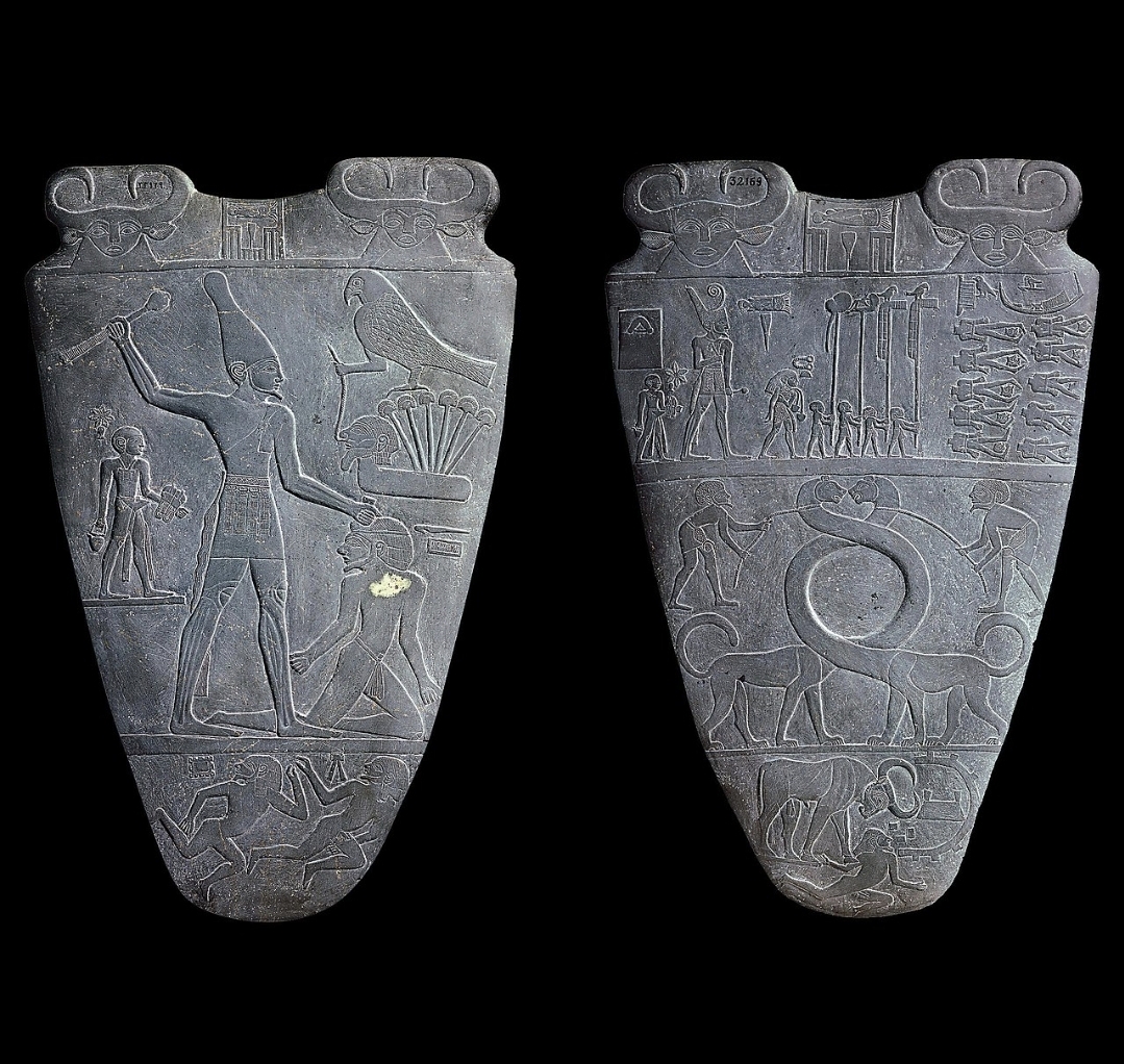 - On one side, Narmer wearing the White Crown (Hedjet) while striking down an enemy, symbolizing his rule over Upper Egypt.