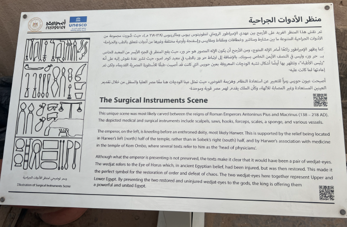 콤 옴보 사원은 단순한 예배 장소가 아니라 고대 치유와 의학의 중심지이기도 했습니다. 가장 흥미로운 특징 중 하나는 벽에 고대 이집트 의사들이 사용했을 법한 수술 도구가 그림으로 자세히 새겨져 있다는 점입니다. 수천 년 전 돌에 새겨진 메스, 겸자, 가위, 약병 등은 고대 이집트의 의료 관행에 대한 정교한 이해를 보여줌과 동시에, 단순한 제사 공간을 뛰어넘어, 치유하는 공간으로서, 치유하는 신전으로서, 사용되었음을 시사합니다.